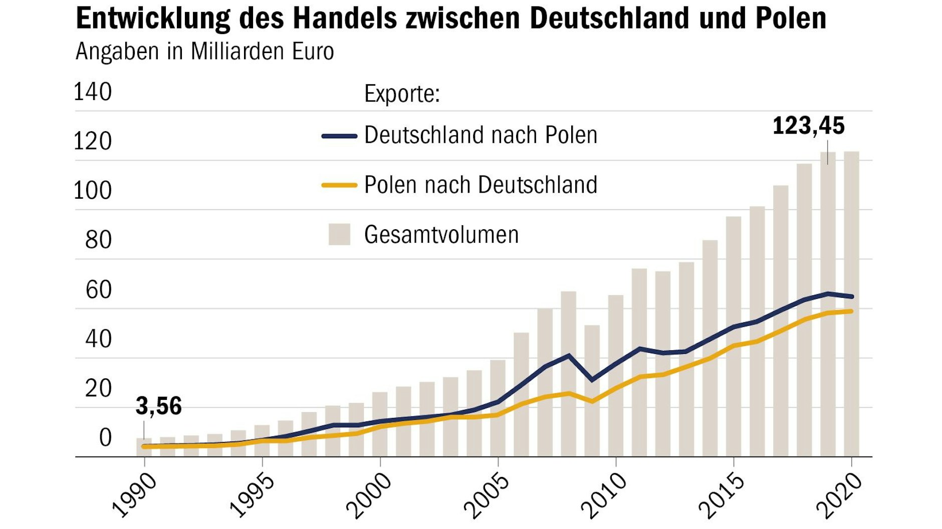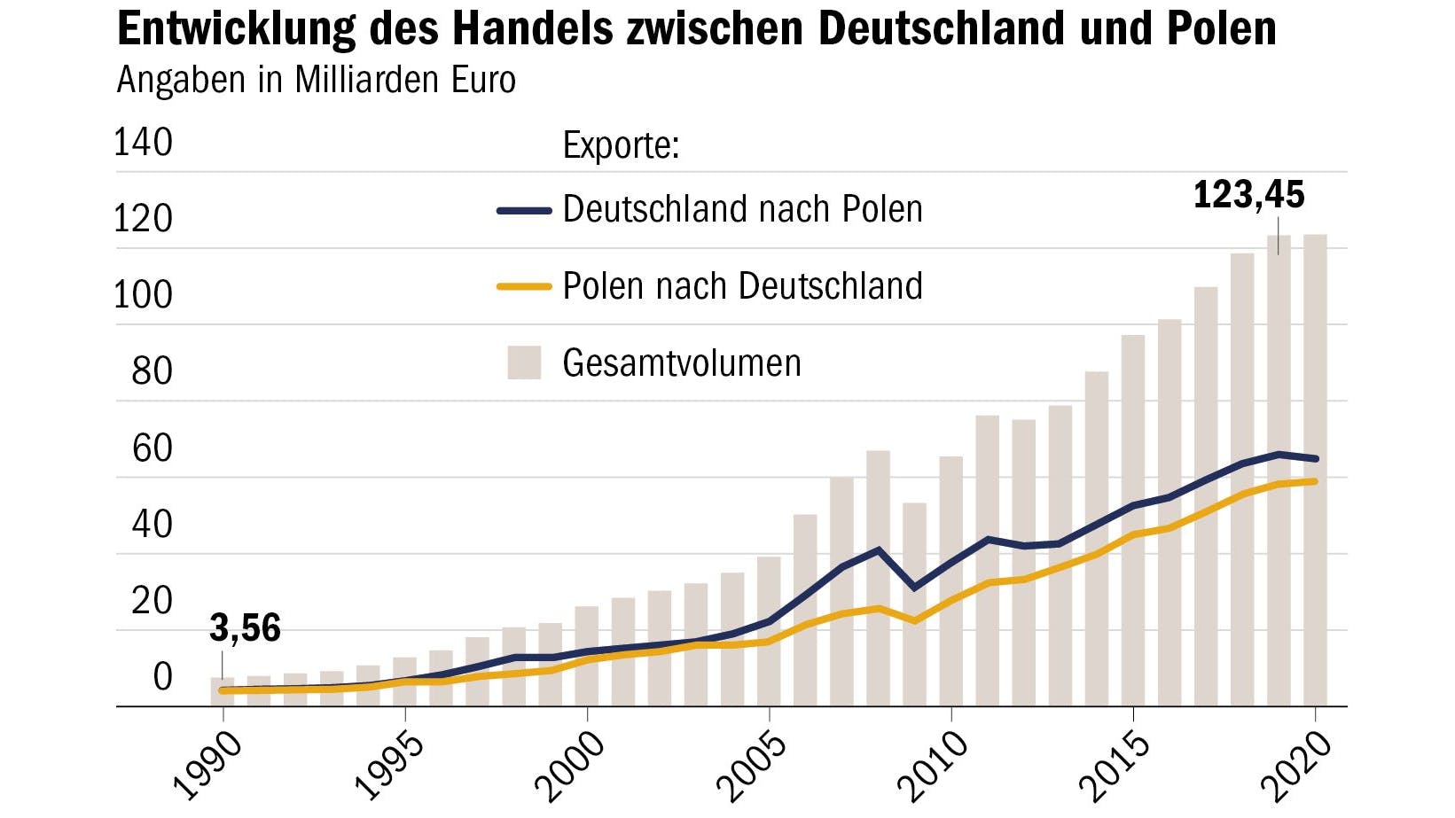 Der polnisch-deutsche Handel umfasste 2020 rund 123 Milliarden Euro, fast drei Mal mehr als der russisch-deutsche, und ist gegenüber den umgerechnet nicht einmal vier Milliarden Euro 1990 astronomisch gestiegen.