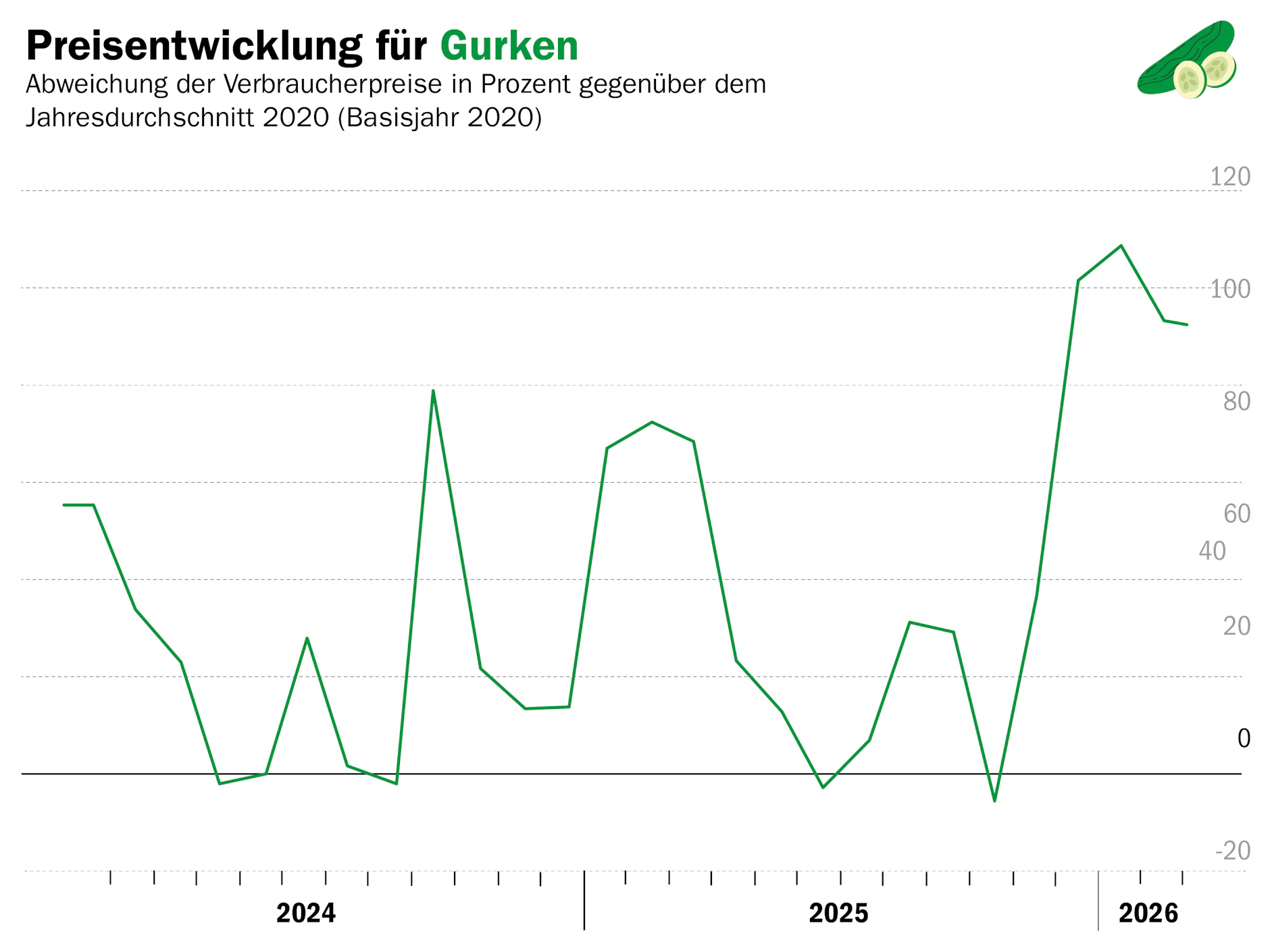 Während es Phasen gab, in denen die Preise unter das durchschnittliche Niveau des Basisjahres 2020 fielen, kam es immer wieder zu deutlichen Spitzen. In diesen Zeiträumen waren Gurken zeitweise mehr als doppelt so teuer wie im Jahr 2020.