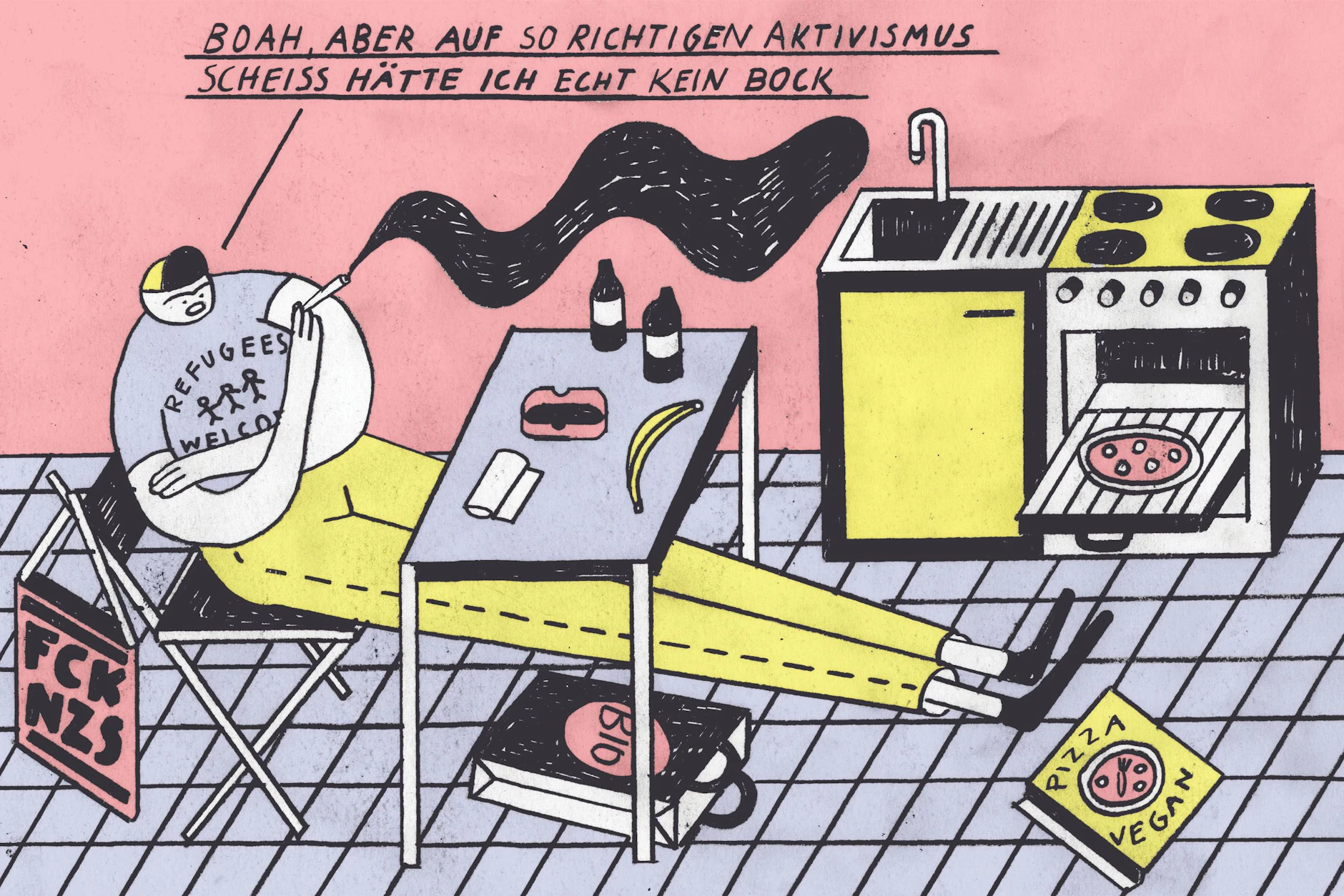 Doch was heißt das eigentlich, „Links-Sein“? Insofern ist die Frage, die Jan Karon in seinem Text aufgeworfen hat, durchaus spannend. Auch Karon definierte sich als (ehemals) irgendwie links, ohne sich dabei aber auf marxistische Traditionen noch auf eine marxistische Analyse einlassen zu wollen. Für die meisten dieser Bauchlinken ist Links-Sein wohl eine Art Lebensgefühl, das daraus besteht, für eine gewisse Zeit in irgendwelchen linken Projekten am Tresen herumzuhängen, billiges Bier zu trinken und ansonsten in einer veganen WG zu wohnen.