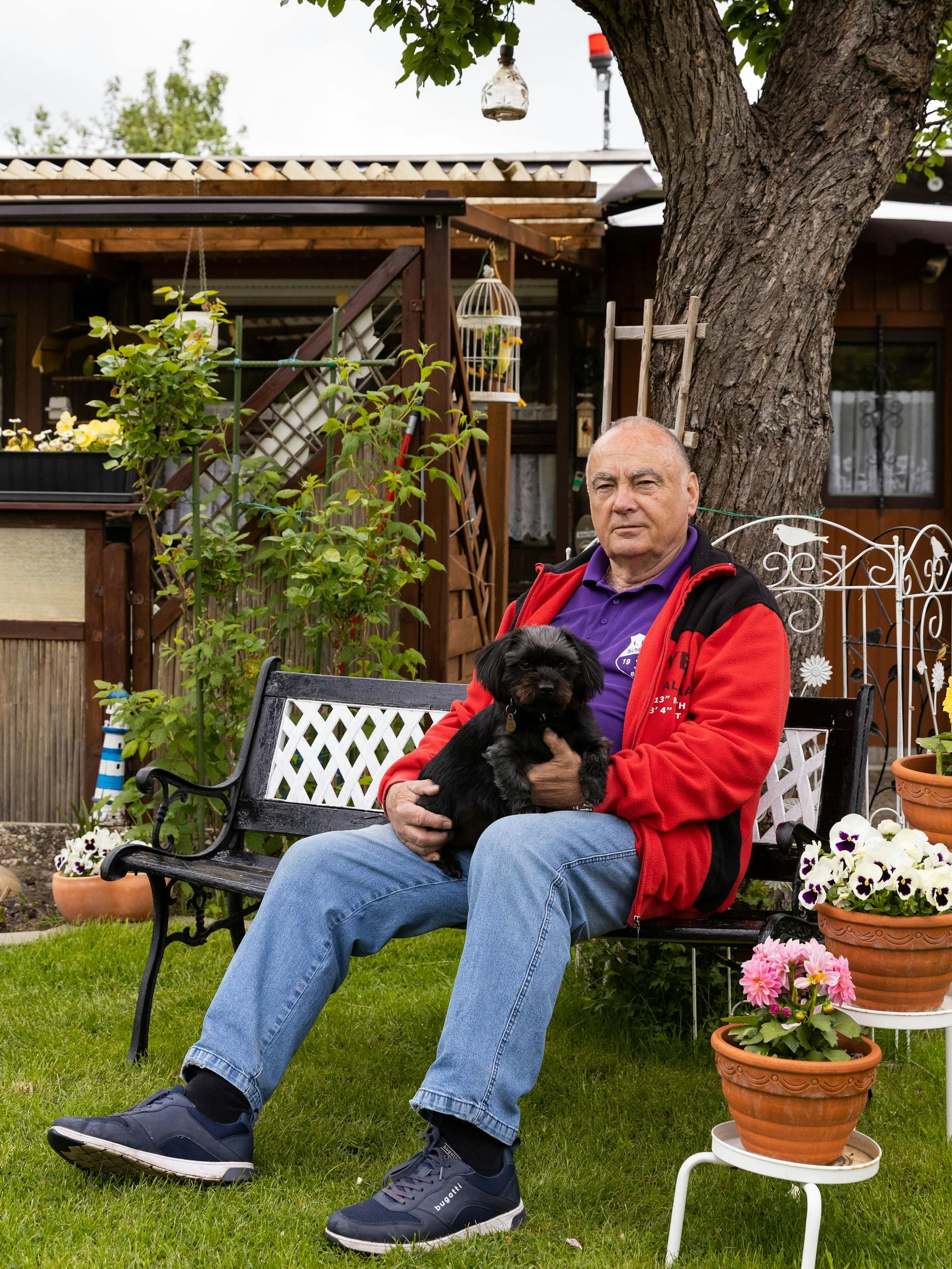 An diesem Dienstagvormittag Mitte Mai sitzt Michael Techert, inzwischen 72, unter dem Vordach seiner Laube im Tulpenweg 65 und trinkt schwarzen Filterkaffee. Im Hintergrund läuft leise Radio „RS2 – Mein Supermix“. Auch die Autobahn rauscht, aber die höre er längst schon nicht mehr, so Techert. Seine Dackelhündin Polly, zwei, liegt neben ihm auf dem Sitzpolster und döst. „Glück“, sagt Techert, „das bedeutet für mich, dass ich endlich keinen Müll mehr sehen muss.“