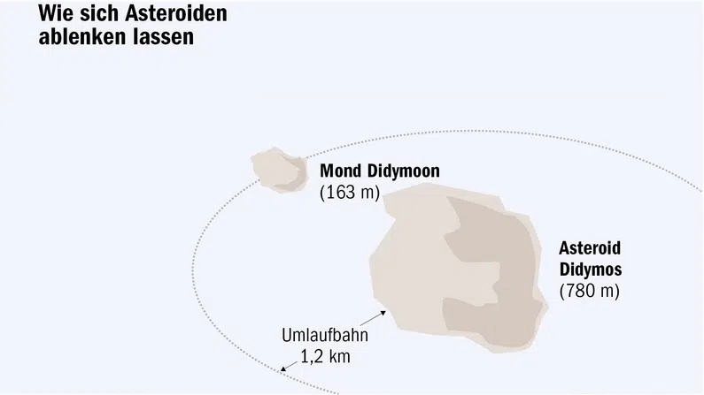 Bei der Mission soll zunächst die Nasa-Sonde „Dart“ 2022 auf den Asteroiden Didymoon treffen. Das ist der kleinere Brocken eines Doppelasteroiden namens Didymos in 150 Millionen Kilometern Entfernung von der Erde. Er besitzt einen Durchmesser von 160 Metern. Der Aufprall der Sonde soll einen Krater hinterlassen und die Umlaufbahn des Himmelskörpers verändern. Didymoon ist der Raumfahrtbehörde zufolge der erste Himmelskörper, der auf diese Weise von seiner Bahn abgelenkt wird.