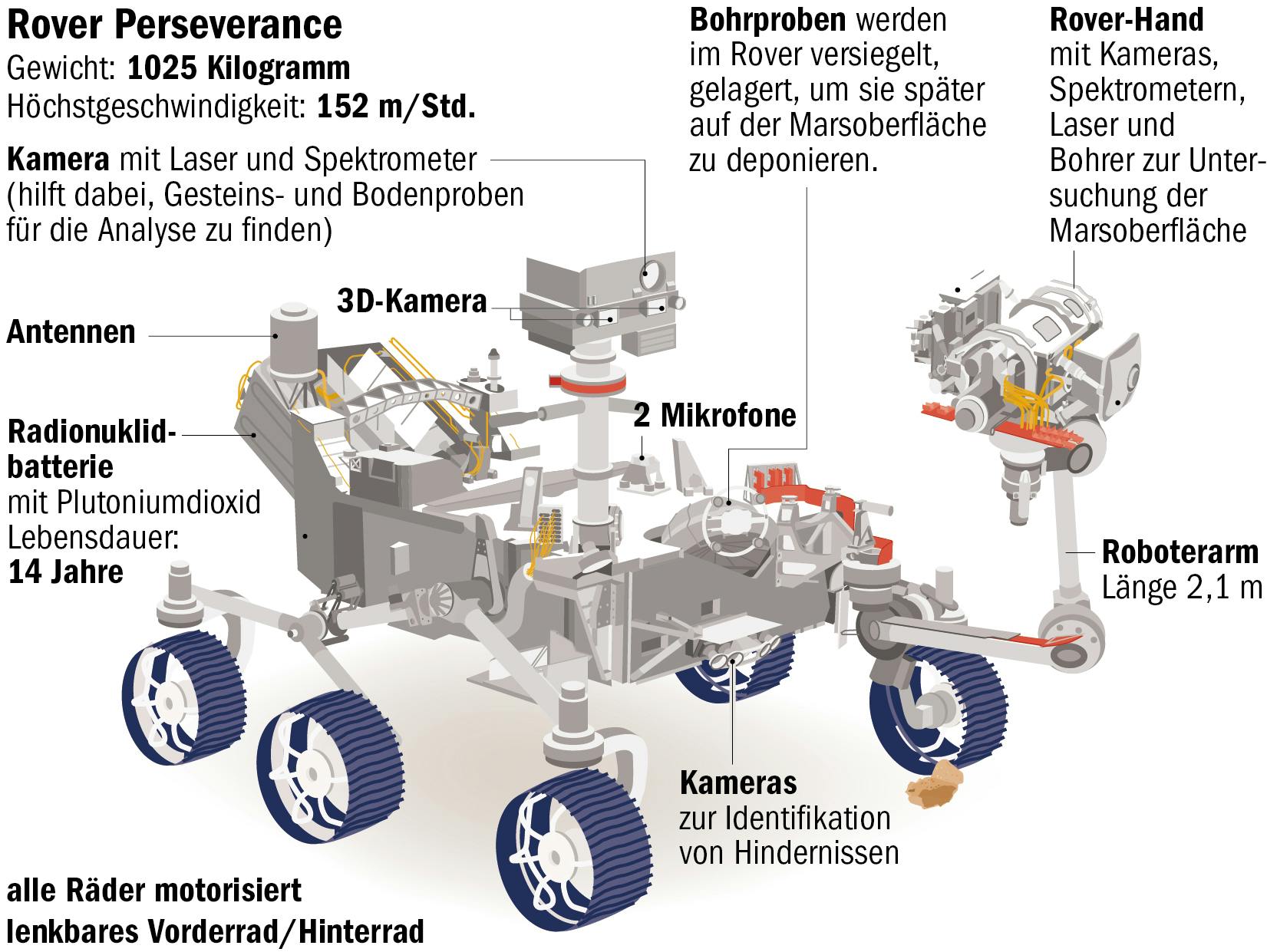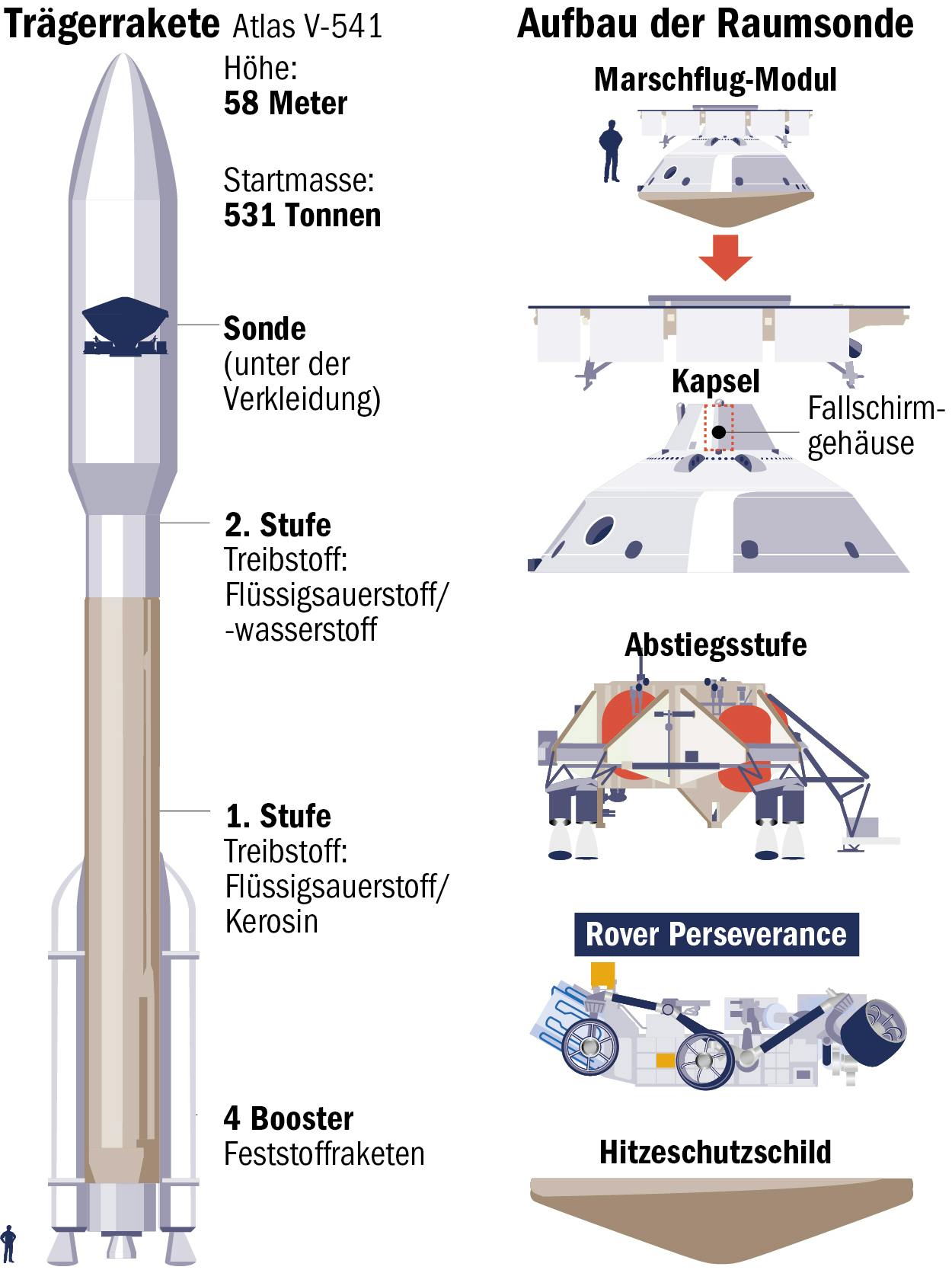 Wenn am 30. Juli im amerikanischen Cape Canaveral eine Atlas-V-Rakete in den Himmel steigt, führt sie eine wertvolle Fracht mit sich: den gut zwei Milliarden Euro teuren Mars-Rover „Perseverance“, übersetzt: Beharrlichkeit oder Ausdauer. Seine Mission hat es in sich: Der Roboter soll Gesteinsproben auf der Oberfläche deponieren, die später eine andere Sonde zur Erde holt. Außerdem wird ein Instrument erstmals Sauerstoff aus der Atmosphäre gewinnen und ein Hubschrauber die Umgebung erkunden. Im Fokus von „Perseverance“ stehen die Klimageschichte unseres Nachbarplaneten und die Suche nach Spuren ehemaligen Lebens.