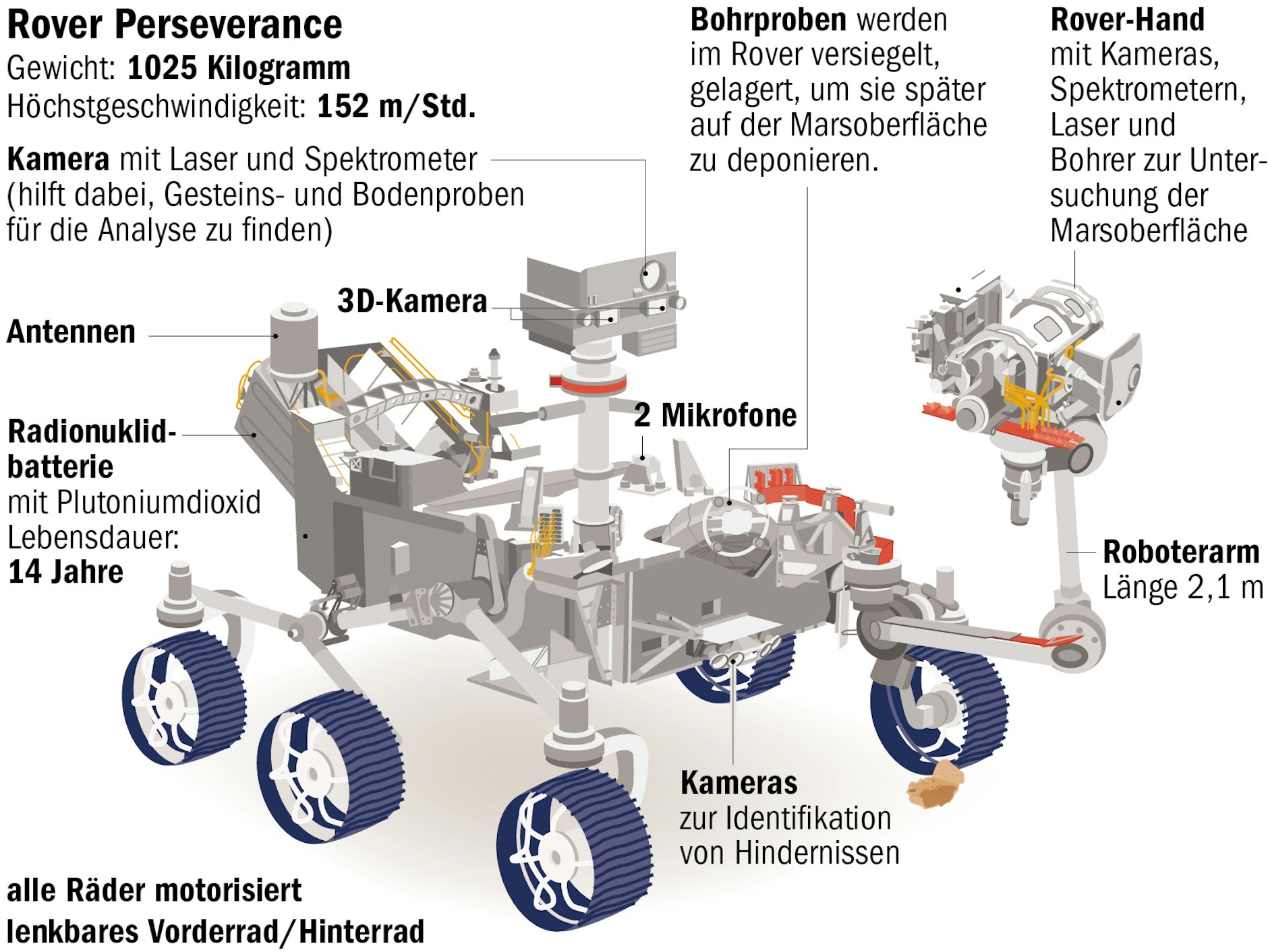 Das Fahrzeug von der Größe eines Kleinwagens verfügt über mehrere Analysewerkzeuge. Das Gerät „Sherloc“ zum Beispiel schießt aus wenigen Zentimetern Abstand einen Laserstrahl auf einen Stein und kann aus dem zurückgestreuten Licht dessen Zusammensetzung messen und nach organischen Substanzen suchen. Mit einer Lupe namens „Watson“ erkennt es sehr kleine Details. Ähnlich funktioniert ein Instrument namens Supercam. Es kann Material analysieren, das bis zu sieben Meter weit entfernt und für den Roboterarm des Rovers eventuell nicht erreichbar ist. Neu ist zudem ein von norwegischen Wissenschaftlern beigesteuertes Radar, das geologische Schichten bis in mehrere Meter Tiefe erkunden kann. Spannend wäre natürlich der Fund von Wasser. Getestet haben Svein-Erik Hamran von der Universität Oslo und Kollegen das Gerät in der Arktis und Antarktis.