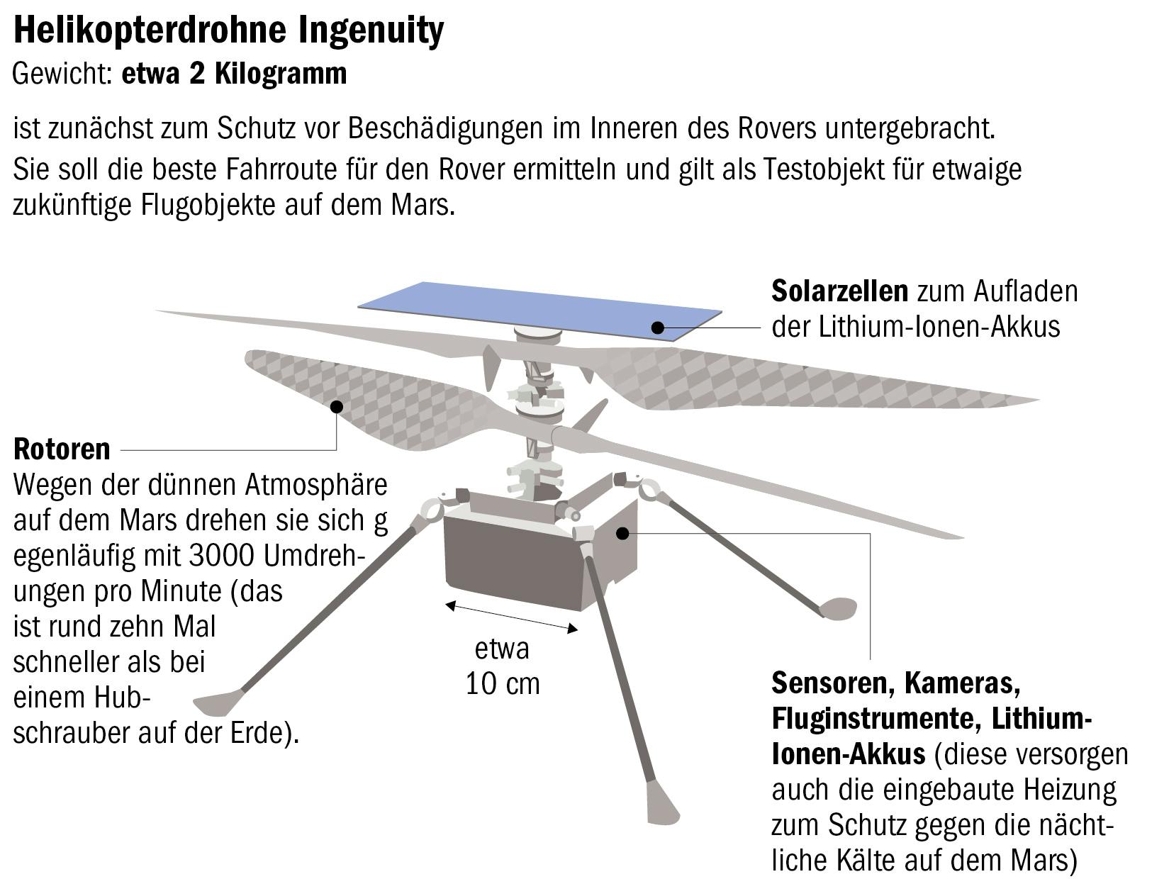 Eine weitere spektakuläre Neuerung hat „Perseverance“ noch an Bord: einen zwei Kilogramm schweren Hubschrauber. Etwa zwei Monate nach der Landung soll „Ingenuity“ (Einfallsreichtum) aufsteigen und autonom die Umgebung erkunden. Für wissenschaftliche Instrumente war kein Platz mehr in dem nicht einmal schuhkartongroßen Körper, aber eine Kamera wird Bilder übertragen. Da der Atmosphärendruck gerade einmal ein halbes Prozent des irdischen beträgt, müssen sich die zwei gegensinnig drehenden Rotorblätter bis zu zehnmal schneller bewegen als bei einem irdischen Hubschrauber.